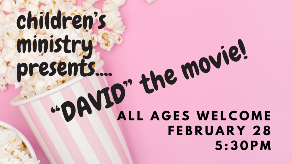 Join Children’s Ministry for a Family Movie Night next Saturday, February 28 at 5:30 p.m. to watch the recently released David movie on the big screen in the sanctuary.  Pizza, popcorn, and drinks provided—all ages are welcome! Please sign up at the back welcome booth tomorrow or by emailing Becky.
